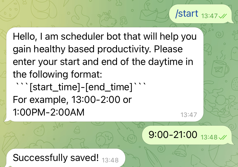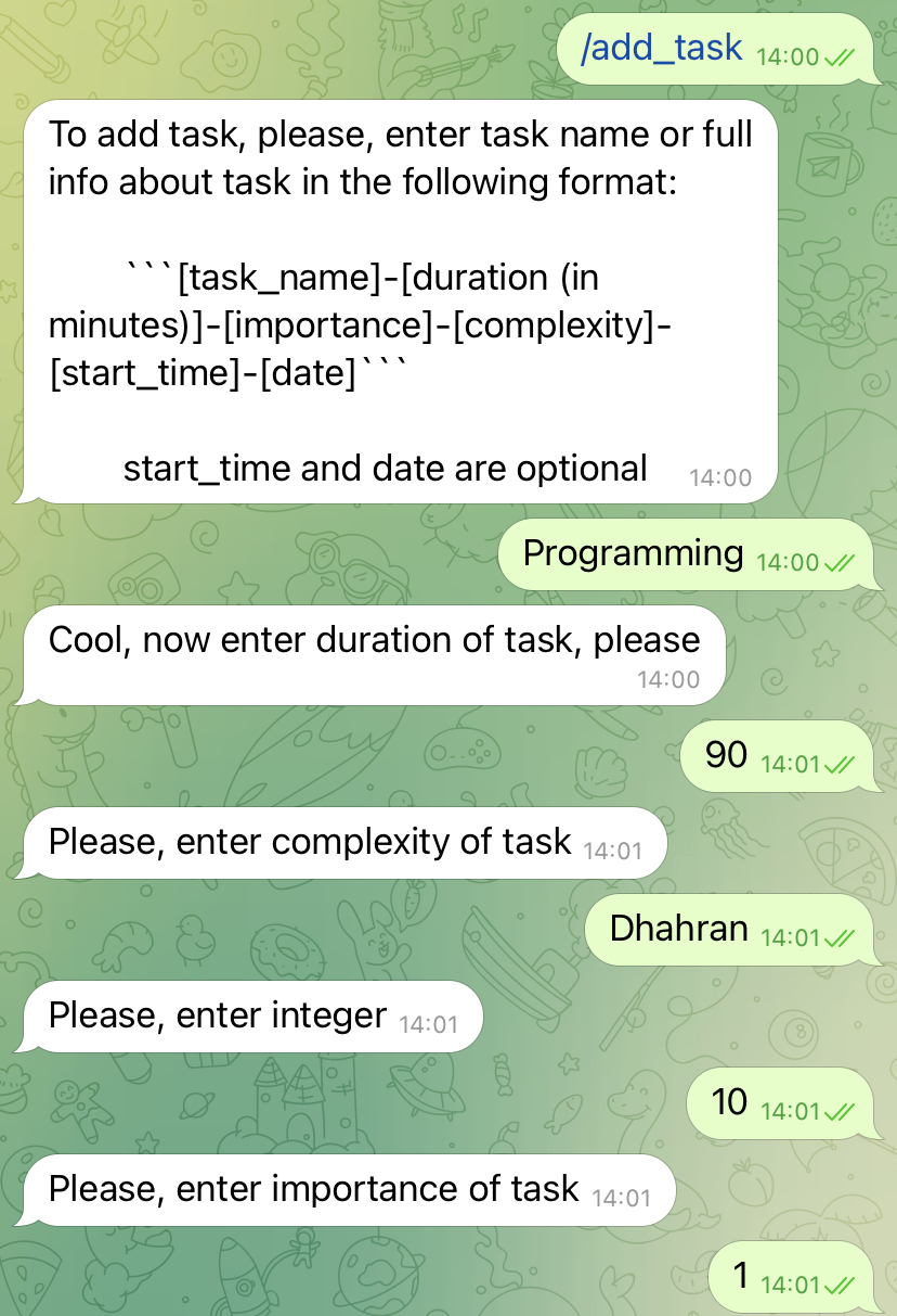 Our product offers the opportunity to optimize a person’s schedule based on his or her activity history. Let’s consider an example where the user systematically estimates his capabilities too optimistically and allocates less time to tasks than he or she actually spends on them. In this case, the system notes this issue and generates a more objective schedule for the day. The ability to create a schedule based on activity history is an innovation of our project. The project implementation will be a chatbot in Telegram. In it, users will be able to work with the list of tasks - add, delete and mark task completion, and receive the generated day schedule.