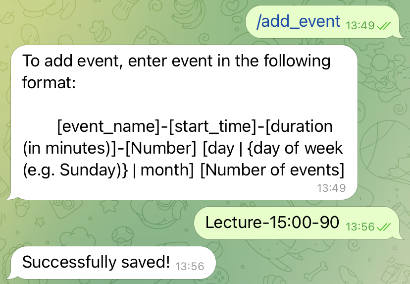> `/add_event` -> adds event, including precise date, start time and duration.