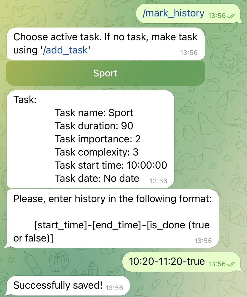 > `/mark_history` -> adds history about task completion, including real start time and duration.