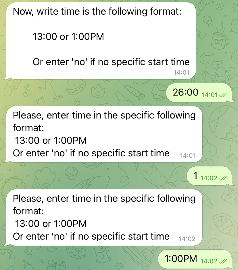 We have implemented the basic skeleton of each activity, i.e. you can enter all the data in a line (image 2) or item by item (image 3). We have also implemented basic message processing - for example, if the user entered the time in the wrong format, he or she will be asked to repeat the input in the right format (image 5).