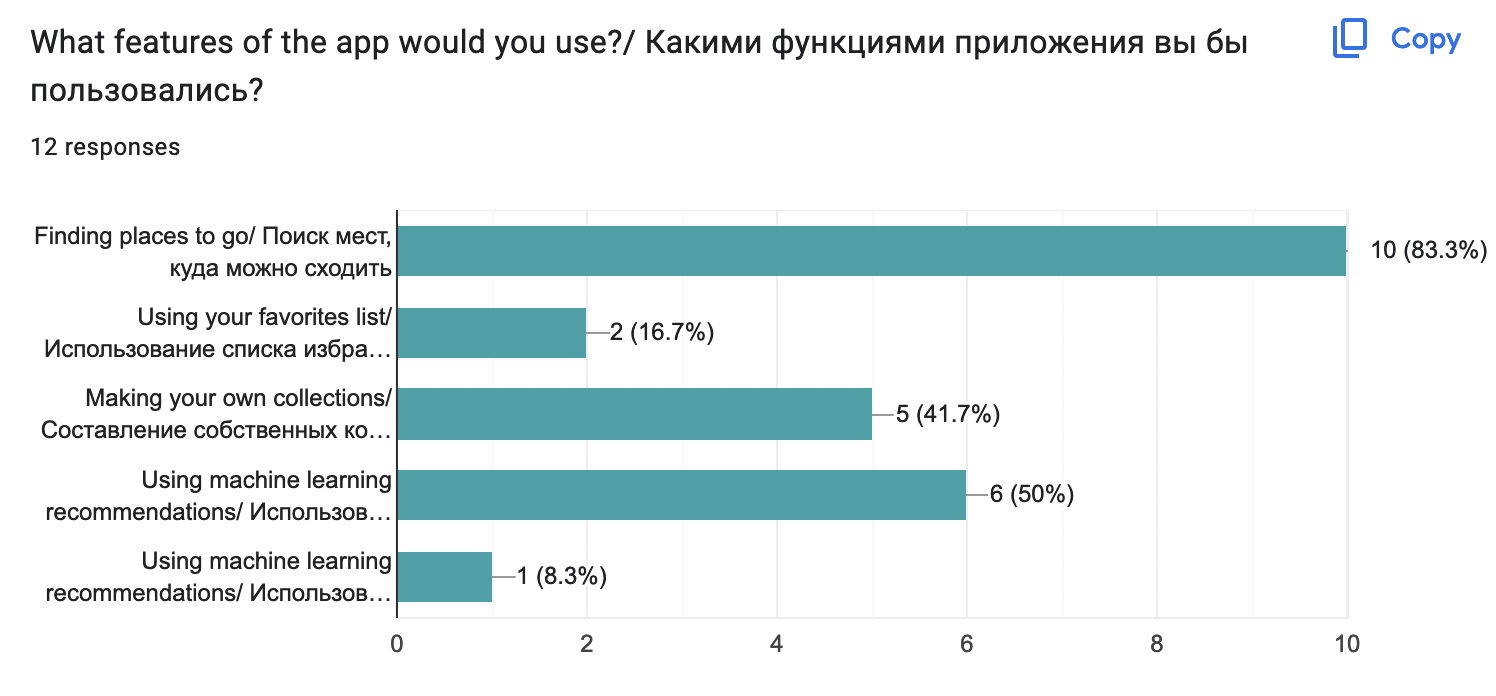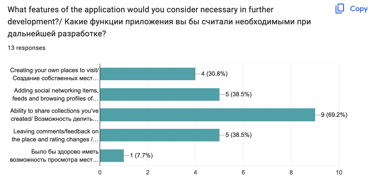 Functionality and vision of the future: This section includes questions about the implemented functions of the application that interested the user. Additionally, it suggests options for improving functionality after the end of the MVP, such as adding personal objects, social networking elements, the ability to share collections of places, and adding comments/feedback to places or their own variant.