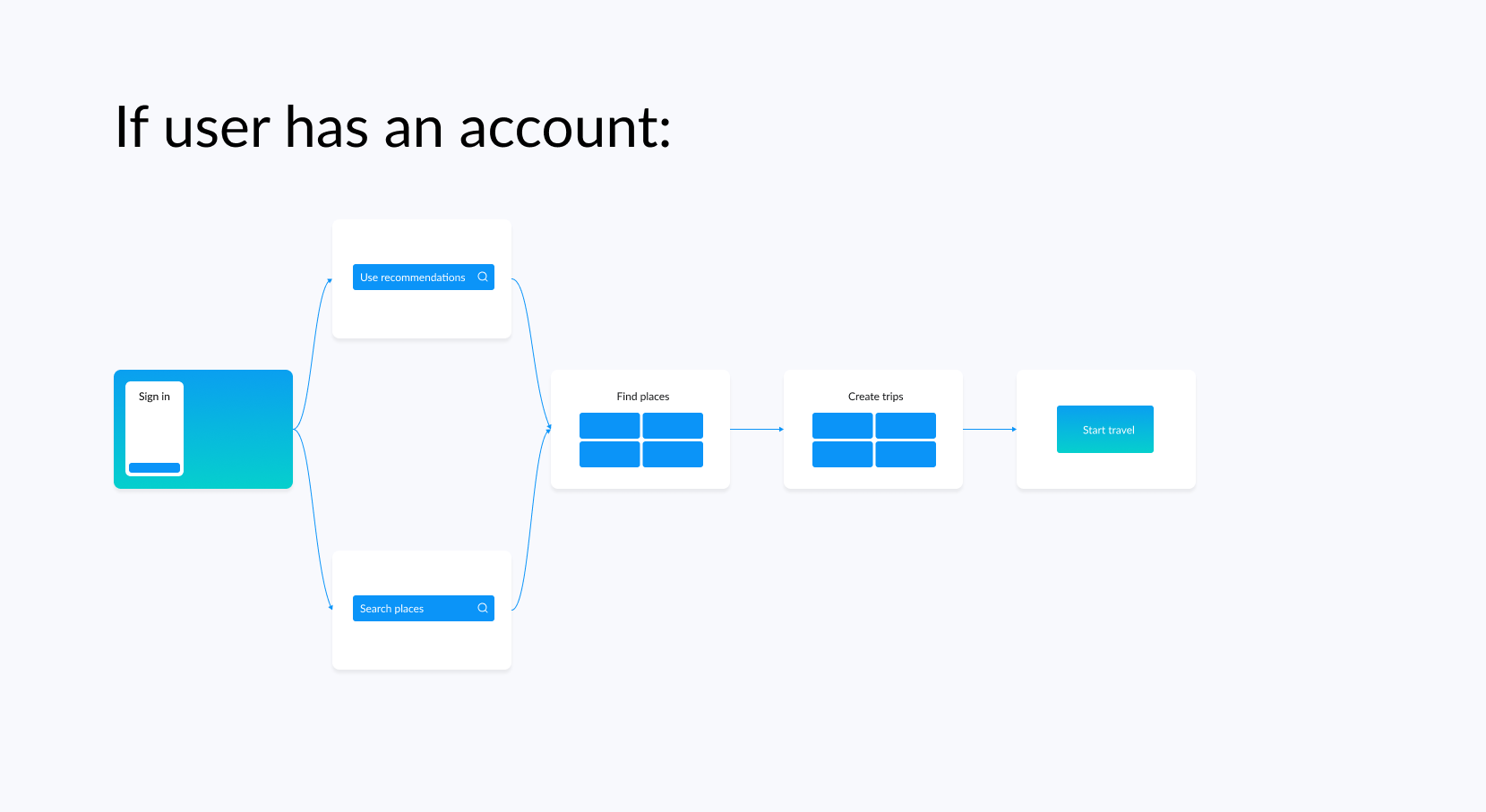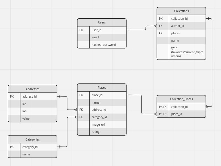After authorization, the user can search places by name or use filters with AI. The main points of the AI logic at the moment are being discussed and will be provided together with the full design. Next, the user can see the search results, add places to favorites and save the object to the chosen trip.