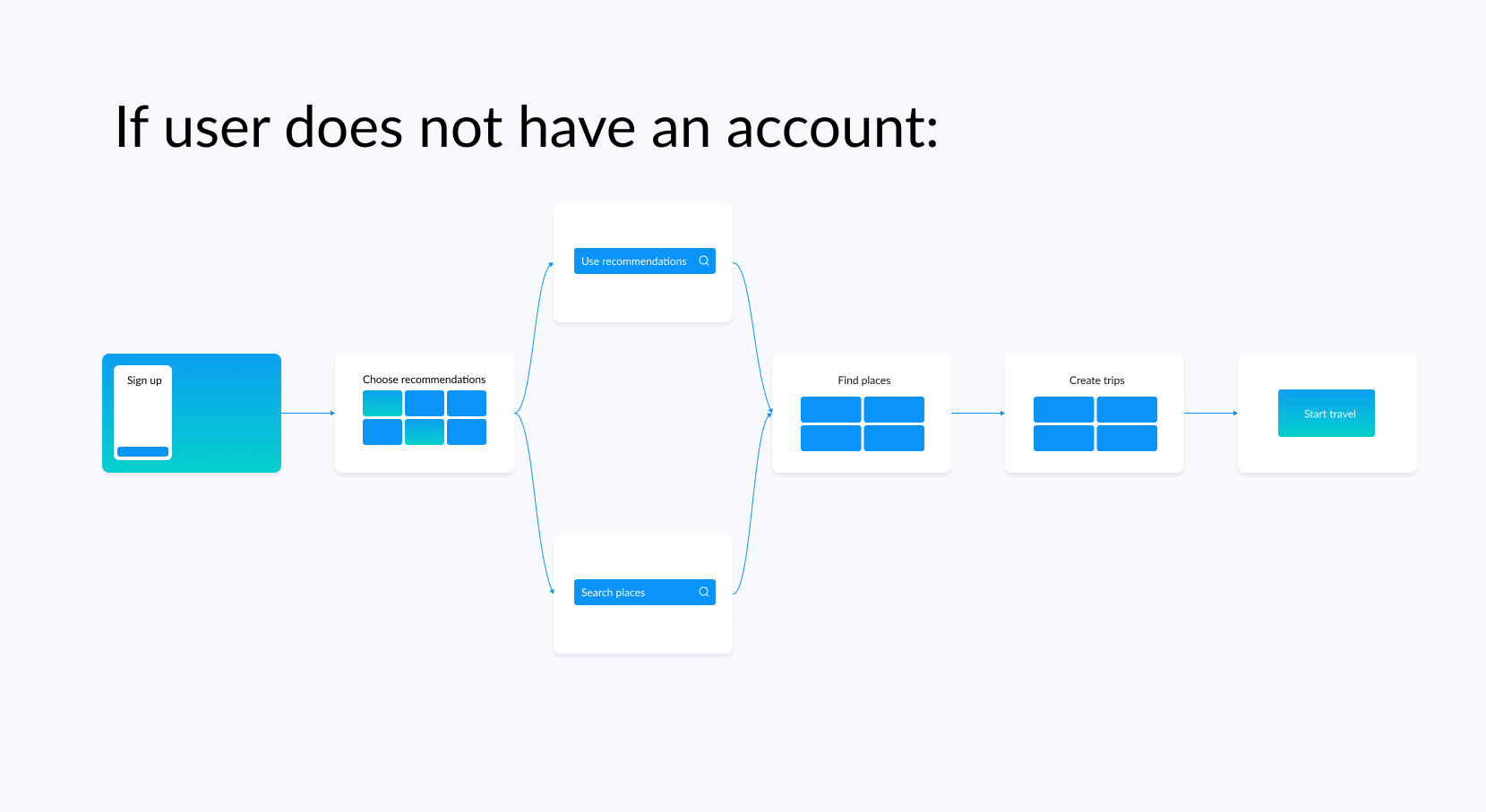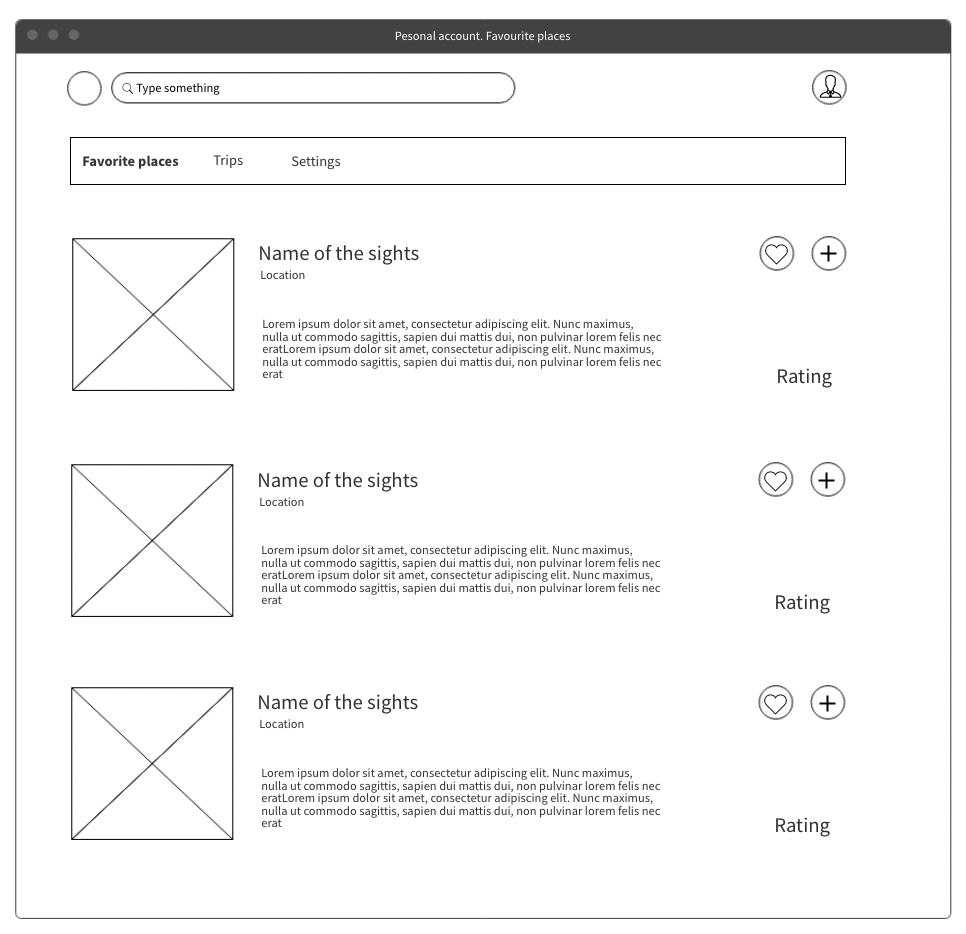 After authorization, the user can search places by name or use filters with AI. The main points of the AI logic at the moment are being discussed and will be provided together with the full design. Next, the user can see the search results, add places to favorites and save the object to the chosen trip.