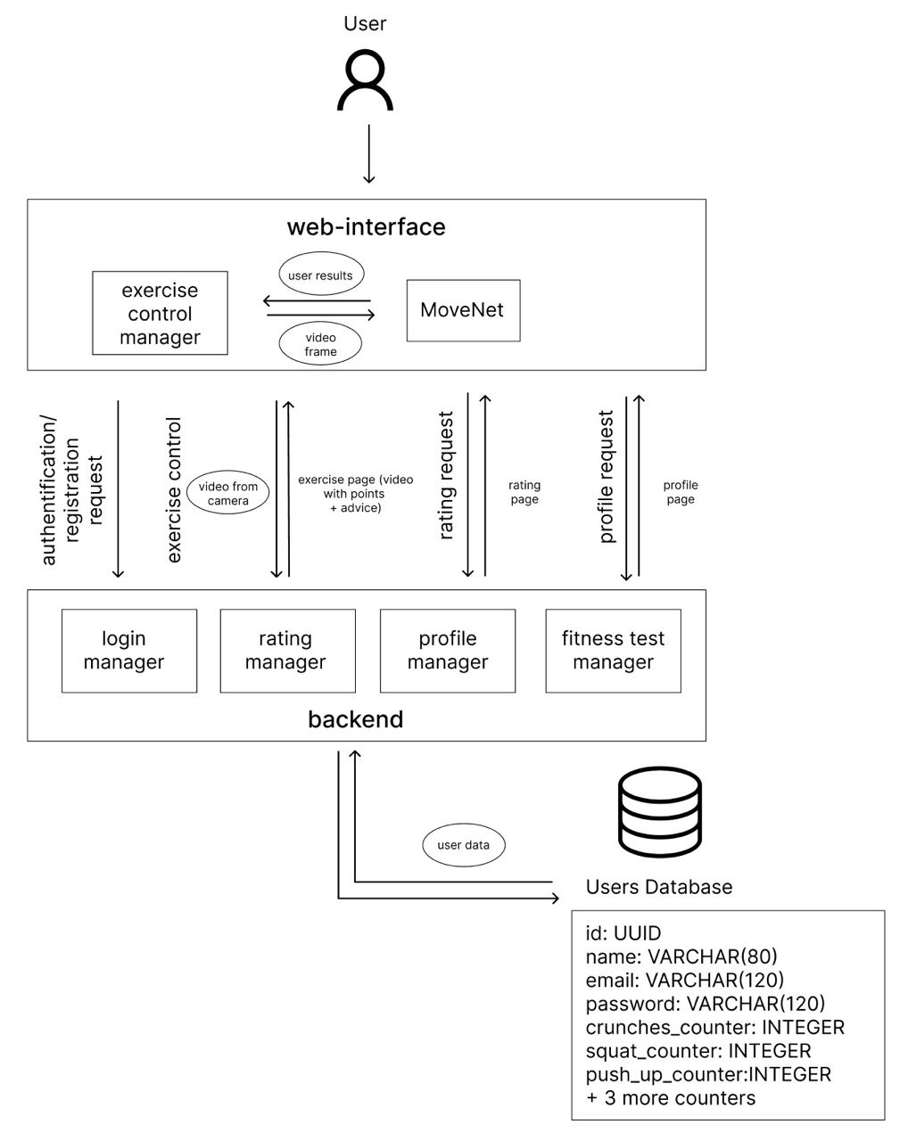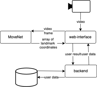 Data flow is organised the following way: video from user’s camera is processed in the web interface, MoveNet adds skeleton to the video, then in the web interface results are calculating and translating to the user. Web interface sends user results or user credentials for log in to the backend and gets user data. Backend communicates with database to store or request user data.