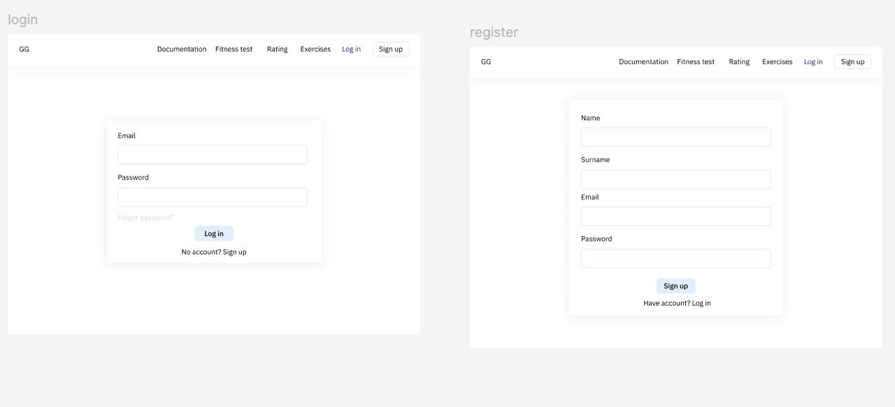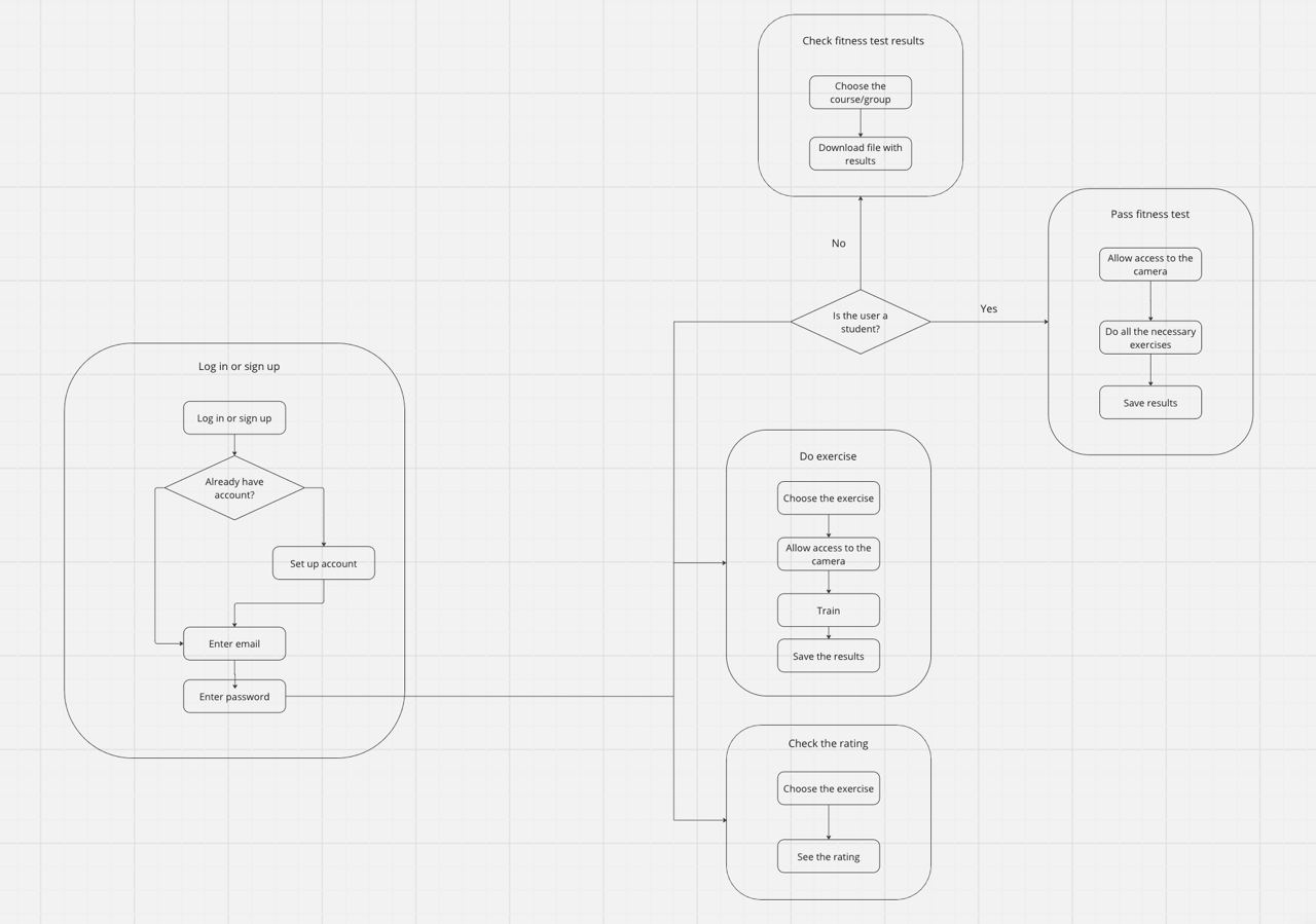 Entering the site the user gets to the main page where the general information about the product is presented. Then, in order to use the offered functionality, the user must log in to his account (if he has already registered before) or register and set up account (specify info, such as first name, last name, e-mail, password and type of account: student or coach). Both student and coach can perform the exercises and view the rating of the chosen exercise. To do the exercise it is necessary to choose it from the list, allow access to the camera and start performing it. When completed, click on the finish button to save the statistics and display it in the rating page and in the profile. The student additionally can pass the fitness test. The procedure is similar to performing a single exercise, except that in this mode it is necessary to perform in sequence all 3 types of exercises included in the fitness test list and the time of doing them is limited. The coach has the ability to download fitness test results by selecting the desired group or course.