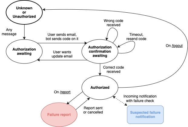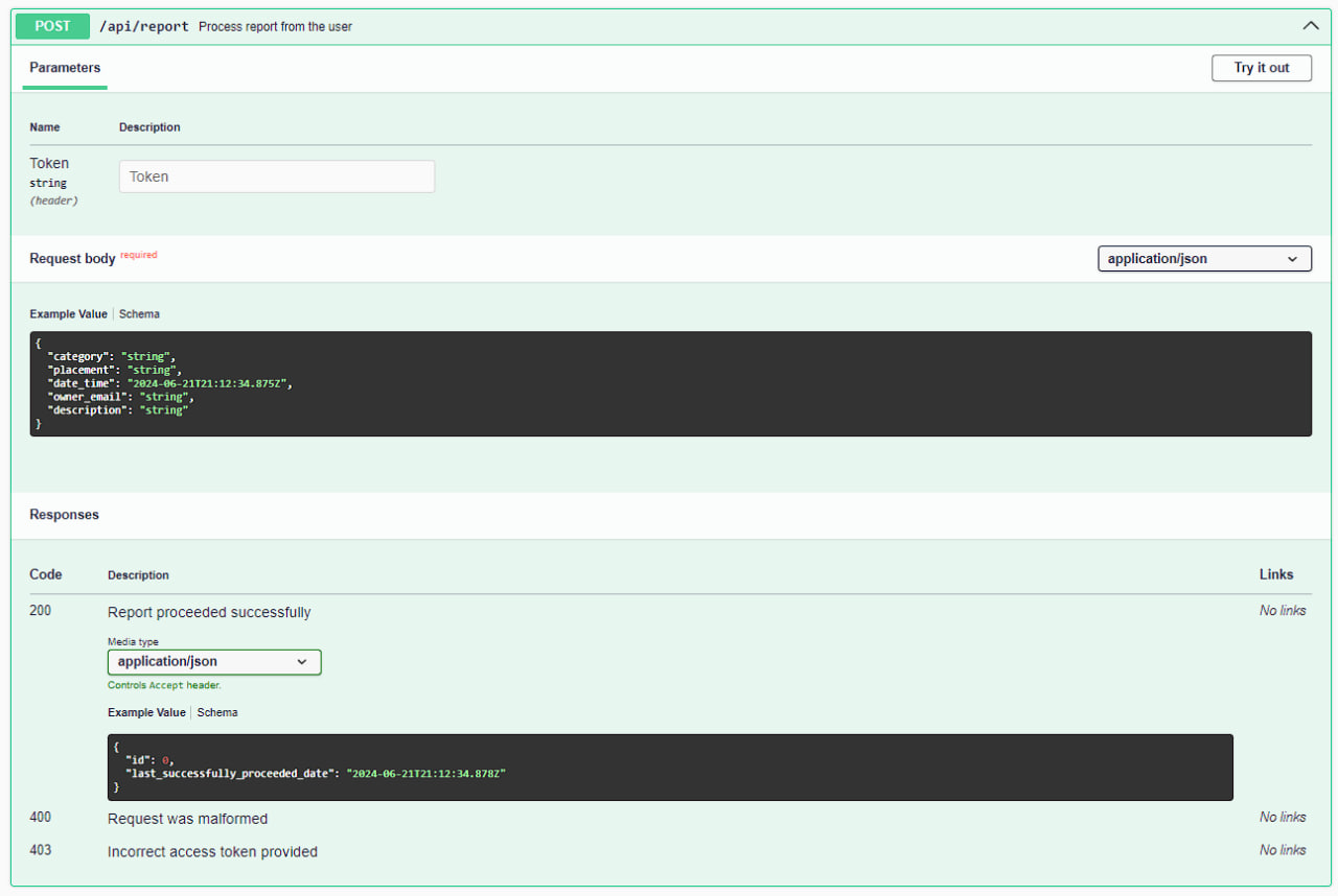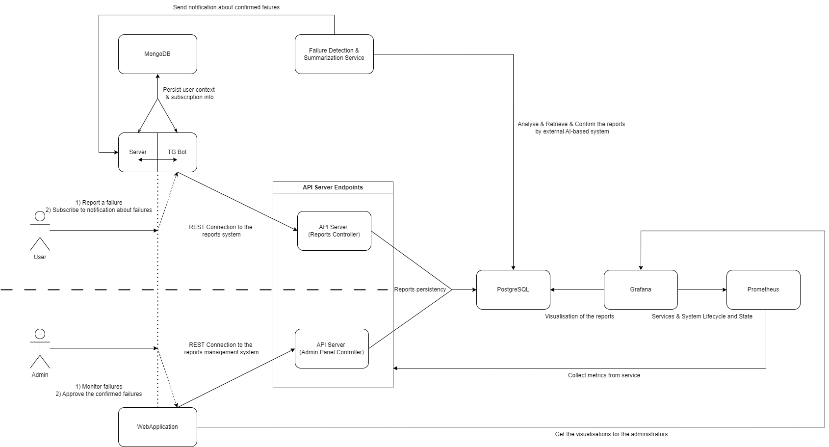- Telegram bot for sending reports: We created a bot that accepts reports from users. The bot is already connected to a MongoDB database to store all the necessary user data, such as email and dialog details. This feature allows for a convenient user-system interaction.