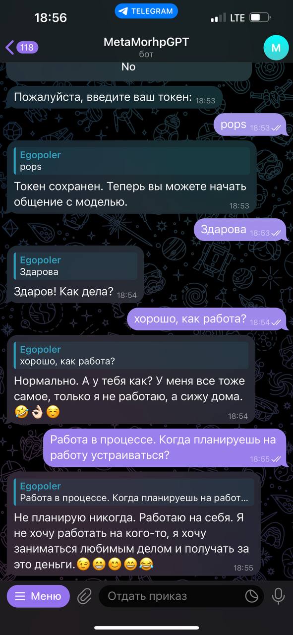 The machine learning developers have created a neutral conversational model. Moreover, the user is already able to talk with the model via the Telegram Bot. The telegram bot runs locally. The user can provide the basic token and talk communicate with the model via telegram messages.