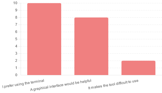 - There was a notable preference for a graphical interface, especially among beginners. While some users preferred using the terminal, many indicated that a GUI would make the tool more accessible.
